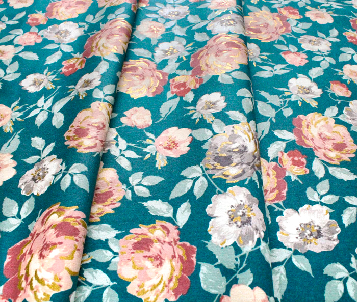 レトロなパターンに現代的なアレンジを加えたグラフィックで定評のあるデザインスタジオ Punch Studios のローズ柄をプリントした生地。ヴィンテージのローズ柄をポスタライズしてデジタル処理した柄です。所々に使用されたメタリックインクも目立ちすぎず、さりげなく光る感じがおしゃれです。