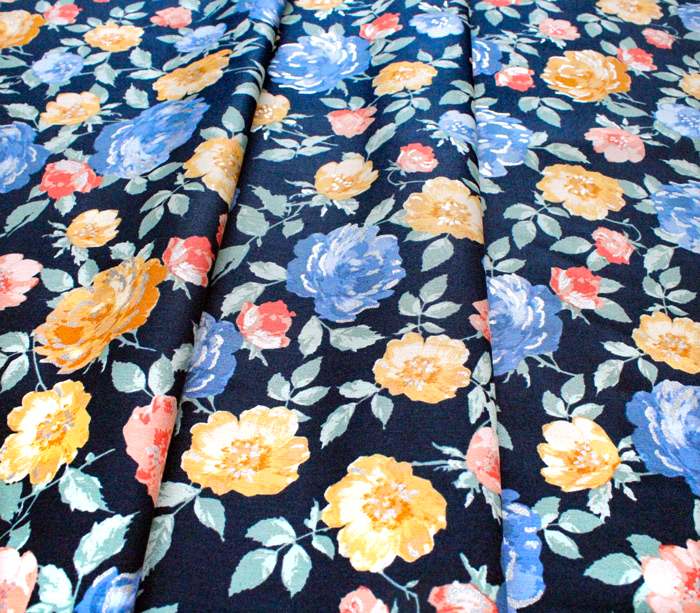 レトロなパターンに現代的なアレンジを加えたグラフィックで定評のある Punch Studios のローズ柄をプリントした生地。ヴィンテージのローズ柄をポスタライズしてデジタル処理した柄です。所々に使用されたメタリックインクも目立ちすぎず、さりげなく光る感じがおしゃれです。