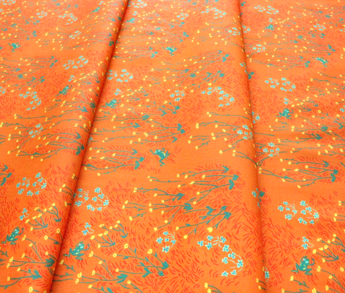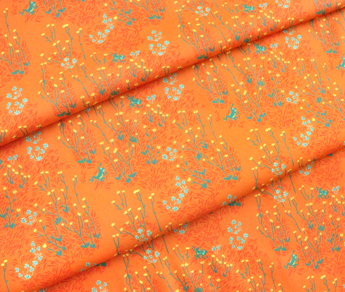 人気デザイナー Heather Ross が描いた野草とカエル柄の生地。オレンジのベースに広がる小花を咲かせた野草。細くて儚げな佇まいでありながらもイエロー&グリーンの小さな花が可憐に咲いています。近くにはカエルが歩く自然の一コマです。