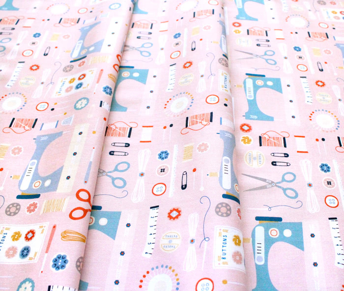 イラストレーター Sally Payne がデザインした「ソーイング」がテーマの生地。ミシンやハサミ、まち針やメジャー、ボビンや指抜きなどソーイングに関連するお馴染みの道具がたくさん並びます。