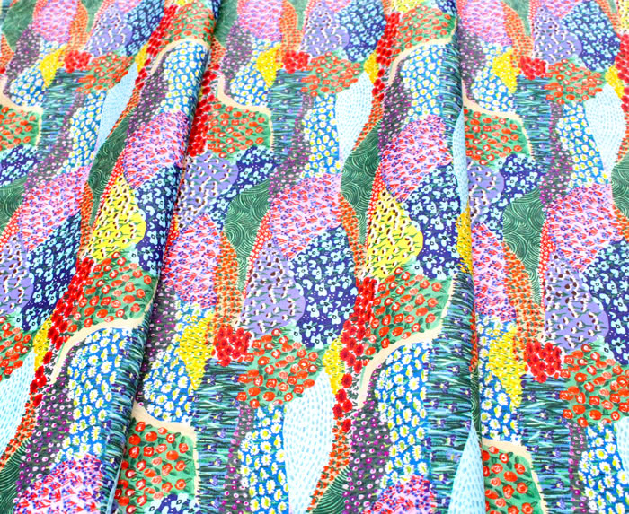 イラストレーター Abby Jacobs の花柄デザインをプリントした生地。色とりどりの花咲く丘が生地いっぱいに広がります。細かく描き込まれた花をよく見ると、バラやマーガレットや菖蒲など、それとわかるような花がたくさん。