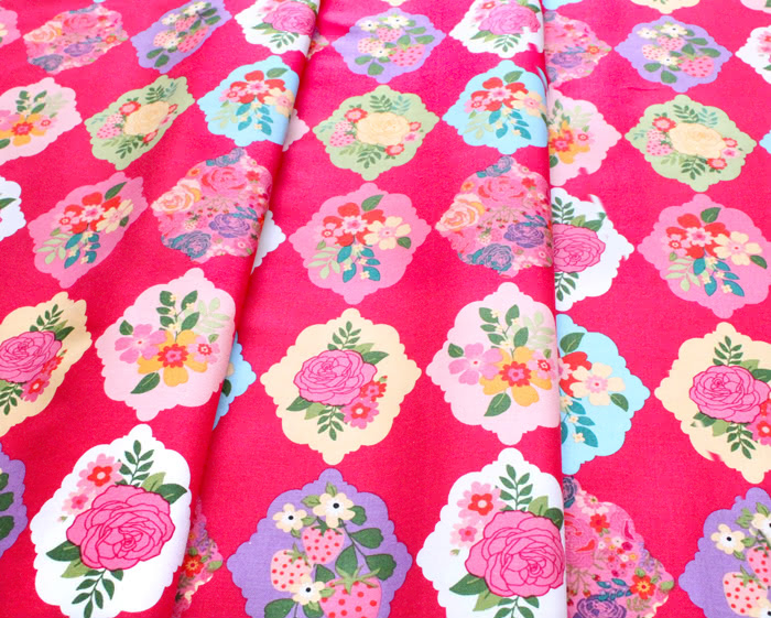 Poppie Cotton社のファウンダーでもあるテキスタイルデザイナー Lori Woods が手がけた壁紙をイメージした花柄生地。鮮やかなラズベリーピンクのベースに並ぶカラフルなクラウド型の模様。その中には様々な花やイチゴが描かれています。鮮やかな配色がお好きな方、ポップな花柄をお探しの方におすすめの生地です。