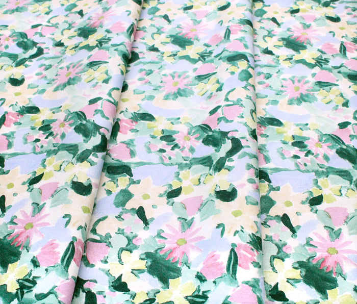 デザインスタジオ Bluebellgrayが手がけた水彩の花柄生地。ちょっぴりラフな筆使いが特徴の水彩ボタニカルデザイン。グリーンを基調とした配色の中にピンクと淡いイエローの花が混じります。可愛いだけじゃない大人の花柄ともいえる可憐な生地です。