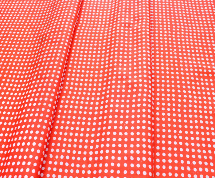 Heather Ross がコーディネートした「Ruby and Bee」のカラーを使用した汎用性の高いドット柄生地。明るいバーミリオンレッドに淡いピンクの歪なドット。絵の具で描かれた元デザインの飛沫やハネもそのままに再現されたプリントです。